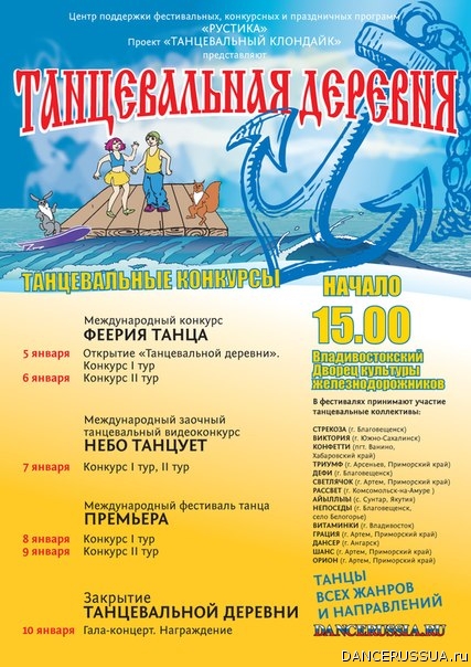 История Владивостока начинается с подписания «Айгунского договора» между Российским и Дайцинским (Китай) государствами от «16 дня 1858 года». История проекта «Танцевальная деревня» в сердце Приморского края начинается с 11-го заезда, который стартовал в дни новогодних праздников 2013 года. Участие сразу в 4-х фестивалях, 100 часов мастер-классов по всем танцевальным направлениям, семинары, презентации, дискотеки в разных танцевальных стилях, индивидуальные разборы номеров в ежедневном расписании участников проекта!