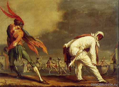 Интересна анонимная неапольская гравюра конца 17-го века на основе серий гравюр Жака Кало, посвященной итальянской комедии Дель арте. Персонажи картины схвачены в экспрессивных, даже негармоничных позах.