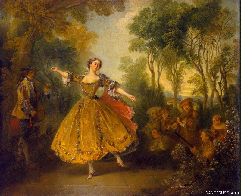 Николя Ланкре изобразил нам танцовщицу Камарго на одноименной картине. Эта дама произвела революцию в искусстве танца 17го века, немного укоротив платье, обнажив щиколотки и чуть-чуть икры. Более короткое платье позволило и даже заставило исполнять более трудные и интересные движения ног. До нее единственными обозреваемыми фрагментами ног были ступни в туфлях, крайнее - щикотолотки. На картине мы видим танцовщицу в "летящей" позе, требующей равновесия, ноги ее выворотны. Так же у Ланкре мы застаем танец с социального ракурса: придворные танцуют на пикнике, развлекаясь (картина "Танец").