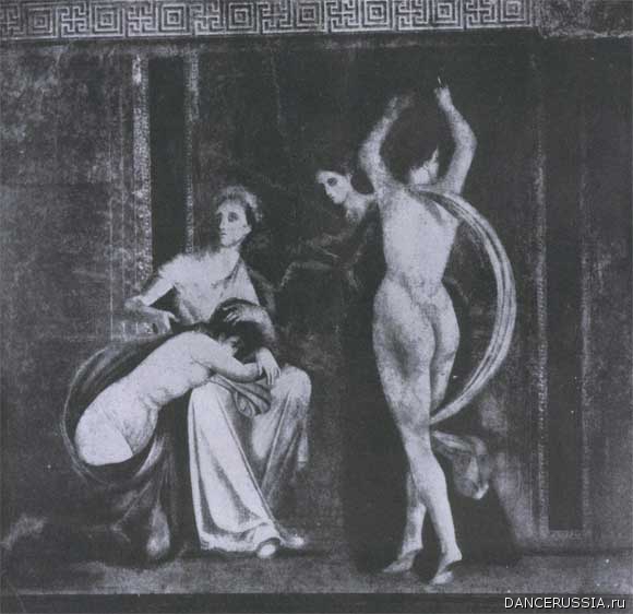 Фрагмент фрески "Виллы Мистерий" в ПомпеяхАнтичные амфоры нередко содержат изображение танцующих. Их движения не скованы, величественны, сильны, уверенны. Танец - воплощение свободы духа, движения души. Здесь приведен фрагмент фрески виллы мистерий в Помпеях.