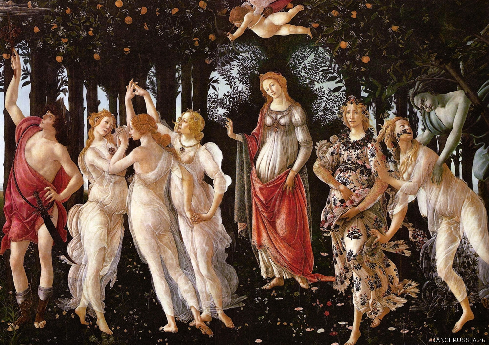Три грации Сандро БоттичеллиРелигиозное средневековье отнеслось к танцу как вредной и дьявольской пляске тела, поэтому так трудно найти старые картины на тему танца. Эпоха возрождения реабилитировала многие вещи, хотя танцы на картинах встретишь все равно редко. С некоторой натяжкой к "танцевальным картинам" можно отнести "Три грации" Сандро Боттичелли.