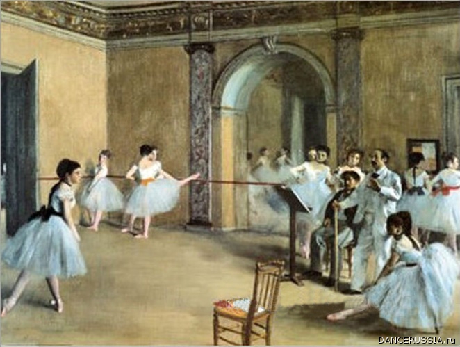 Дега - Танцевальный класс "Танцевальный класс", 1874. Вместе с танцовщицами изображен Жюль Перро - мастер романтического балета. Каждая танцовщица занята каким-то своим делом. В этих танцовщицах еще есть хрупкость, одухотворенность, изящество, которые нередко затем будут уступать место усталости и изможденности, угловатости и нескладности, обреченности. Возможно, сказались полученные знания о тяжком труде у станка. Возможно, на картины наложили отпечаток личные события в жизни художника.
