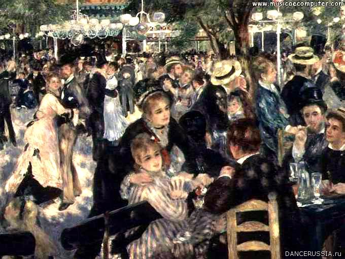 Ренуар Танцы в Мулен де ля ГалетКартины Ренуара светятся любовью к жизни и окружающему миру, они несут теплые чувства, пронизаны радостью бытия. Серия картин на танцевальную тему: "Танцы в Мулен де ля Галет" 1876г., "Танец в Бужевале" 1883 г., "танец в городе" и "Танец в деревне". Изображены парные танцы, которым люди предаются, облекая свой досуг в культурную форму. Мы видим общение мужчины и женщины - разное в зависимости от их социальной принадлежности. Манеры в деревне, конечно, иные, чем в городе, что любопытно проскальзывает в позах и выражении лиц. Но в отношении танца как искусства нам эти картины ничего не дают.