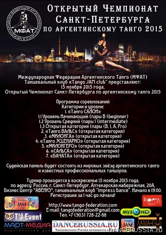 | Чемпионат Санкт-Петербурга по аргентинскому танго 2015 15 ноября 2015 в Санкт-Петербурге пройдёт одно из самых знаковых событий в жизни танцевального мира – Официальный открытый Чемпионат Санкт-Петербурга по аргентинскому танго 2015.
