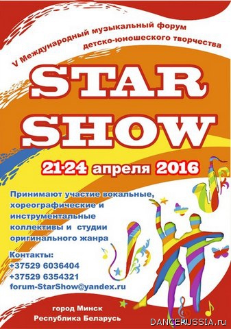Все новости STAR SHOW приглашает в Минск Торопитесь подать заявку на участие в V Международном форуме-конкурсе детско-юношеского творчества "STAR SHOW" 21.04.2016– 24.04.2016, Республика Беларусь, г. Минск.