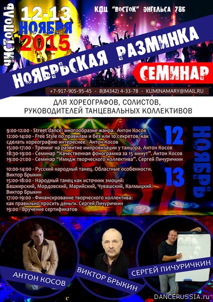 | НОЯБРЬСКАЯ РАЗМИНКА В ЧИСТОПОЛЕ В программе семинара специальная методология и практические занятия от ведущих хореографов России. По результатам семинара слушатели получат навыки и откроют новые возможности в танцевальном творчестве.