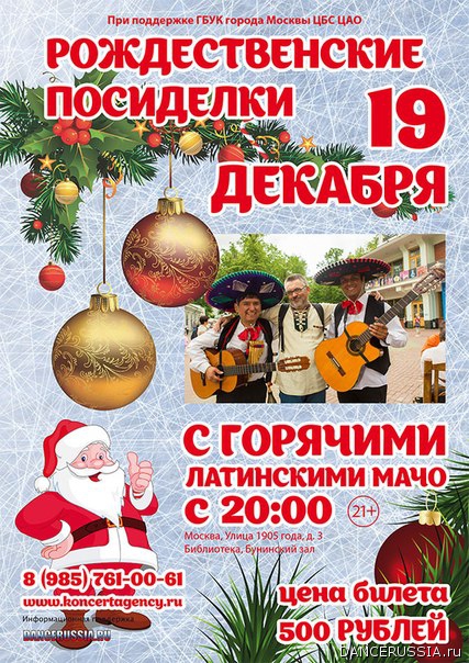 | Рождественские посиделки с горячими латинскими мачо в Бунинском зале Настоящая латиноамериканская вечеринка - это, возможно, то, о чем вы мечтали всегда! На расстоянии вытянутой руки от артиста просто отдаться музыке и ритму, а уж остальное сделает ваша вырвавшаяся на волю чувственность.