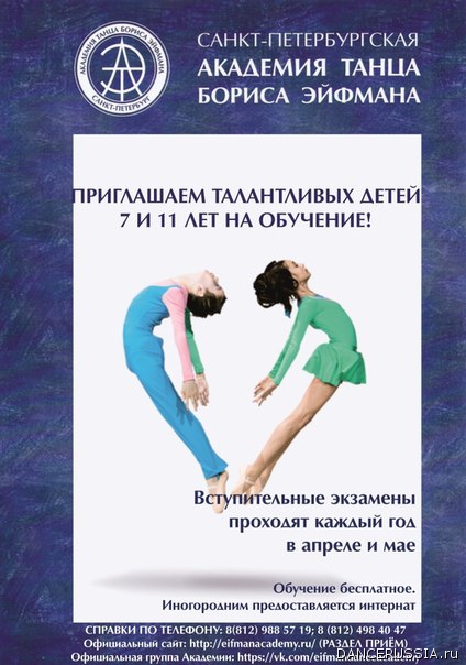 | Академия приглашает талантливых детей Объявлена запись на вступительные экзамены 2015-2016 учебный год! Санкт-Петербургская Академия танца Бориса Эйфмана приглашает талантливых детей в возрасте 7 и 11 лет со всей России.