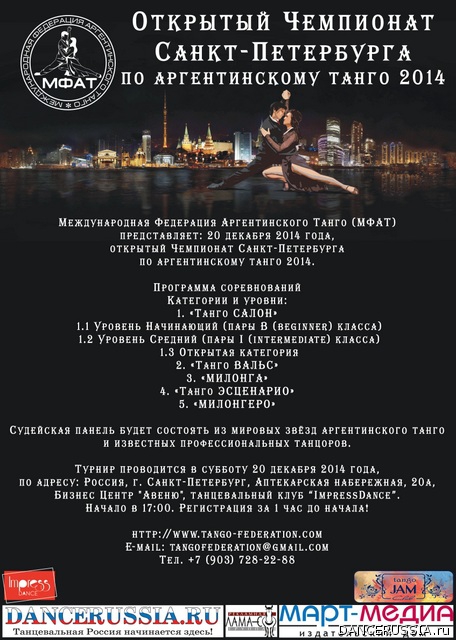 | Открытый Чемпионат по аргентинскому танго 2014 Международная Федерация Аргентинского Танго (МФАТ) представляет: 20 декабря 2014 года, открытый Чемпионат Санкт-Петербурга по аргентинскому танго 2014. К участию допускаются профессионалы и любители.
