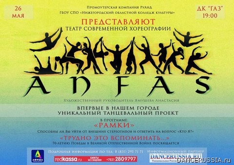 Все новости Уникальный танцевальный проект Театр современной хореографии "Анфас" впервые в Нижнем Новгороде представляет уникальный танцевальный проект. 26 мая 2015 в 19-00.