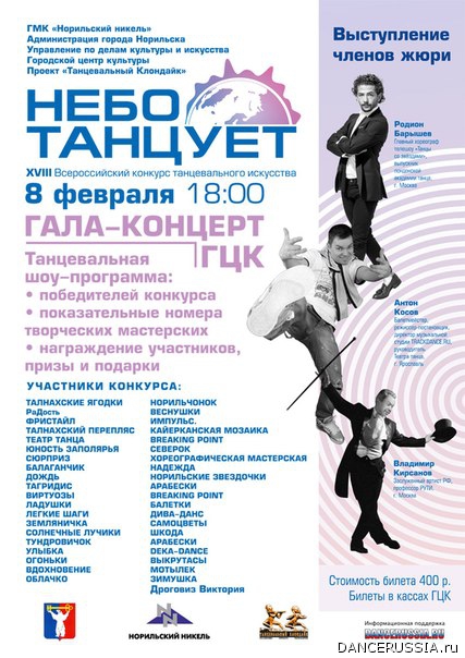 | "НЕБО ТАНЦУЕТ", УКРАШАЯ МИР ЗВЕЗДАМИ. ЭТИ ЗВЕЗДЫ - ВЫ! Конкурс НЕБО ТАНЦУЕТ хорошо известен многим танцорам как заочный видеоконкурс. Более 200 коллективов получили дипломы конкурса, когда он проводился в заочной форме. НЕБО ТАНЦУЕТ начал проводиться в рамках проекта "Танцевальная деревня" в очной форме.