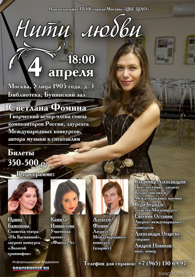 | "Нити любви" в Бунинском зале Творческий вечер Светланы ФОМИНОЙ. 4 апреля. Количество мест ограничено! Стоимость билета 300 рублей! Концертное полотно соткано из "нитей любви" - песен, стихов, авторских музыкальных произведений и конечно же весеннего настроения.