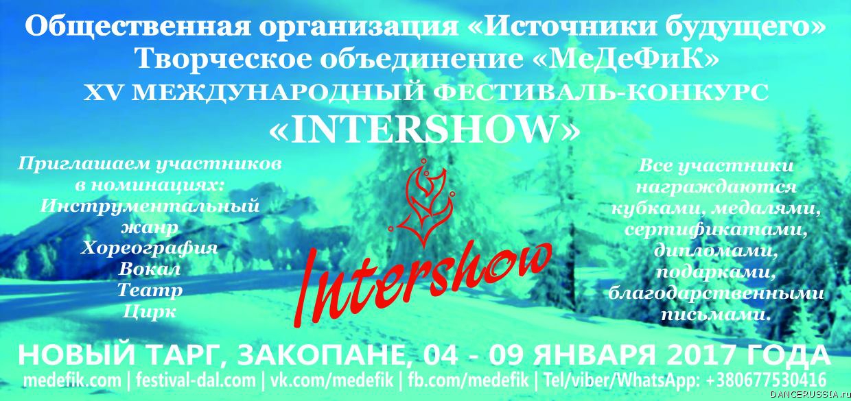 Событие, информационным партнером которого является проект "Танцевальный клондайк" и сайт DANCERUSSIA.ru . Приглашаем творческие коллективы на XV Международный фестиваль-конкурс INTER SHOW в Польше. 4 - 9 января 2017 года. Польша, Закопане.